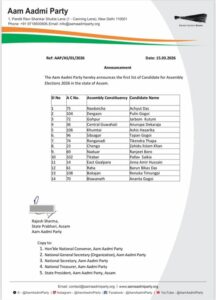 Aam Aadmi Party (AAP) on Sunday released its first list of 14 candidates for the Assam assembly elections 2026.