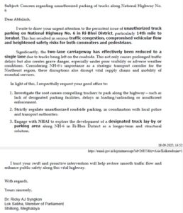 Acting on the MP’s letter, DC Abhilash Baranwal directed the Ri-Bhoi police to enforce a complete ban on roadside parking between Byrnihat and Jorabat to ensure road safety and prevent accidents.